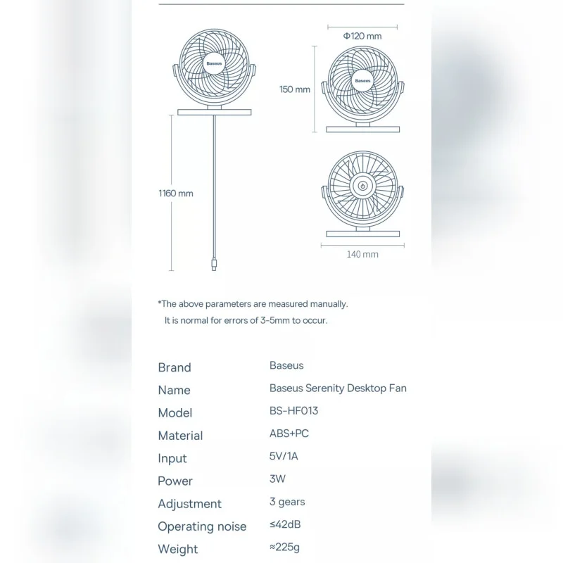 کمپانی بیسوس این محصول را در دو رنگ طراحی و تولید کرده است. رنگ سفید با کد ACYY000002 و رنگ سورمه ای با کد ACYY000003 نشان داده میشود.زمانی که صحبت از لوازم سرمایشی می شود اولین گزینه هایی که به ذهن می رسد کولرها و پنکه ها هستند اما جالب است بدانید پنکه سرما تولید نمی کند. پنکه ها فقط هوای اطراف خود را جا به جا می کنند و در صورتی که در محیط سرد قرار بگیرد سرما را تشدید کرده و در صورت قرار گرفتن در محیط گرم ، آن را در محیط پخش می کند. پنکه بیسوس Baseus ACYY000002 Serenity Desktop Fan به صورت رومیزی طراحی شده است.