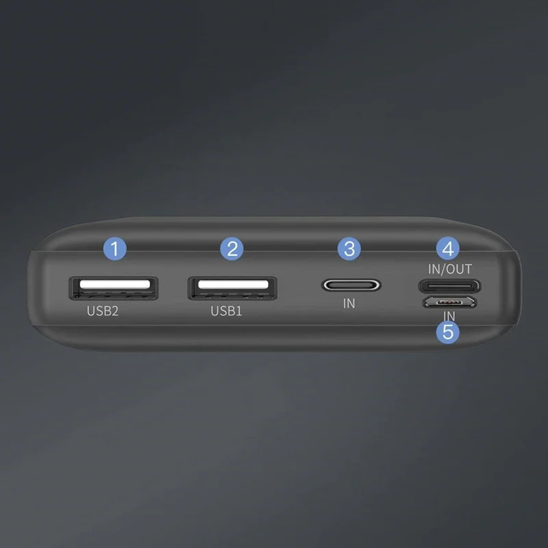 همچنین ورودی های پاوربانک Baseus Mini JA X30 نیز بسیار تکمیل است و دارای سه پورت ورودی می باشد. می توانید آن را با هر سه نوع پورت مرسوم تایپ سی، میکرو یو اس بی و لایتنینگ شارژ کنید.در حاشیه پاوربانک Baseus Mini JA X30 چهار چراغ LED قرار دارد که به شما میزان شارژ پاوربانک را نشان می دهد و شما به وسیله آن ها به راحتی می توانید میزان شارژ محصول خود را مدیریت کنید. بدنه پاوربانک BASEUS MINI JA